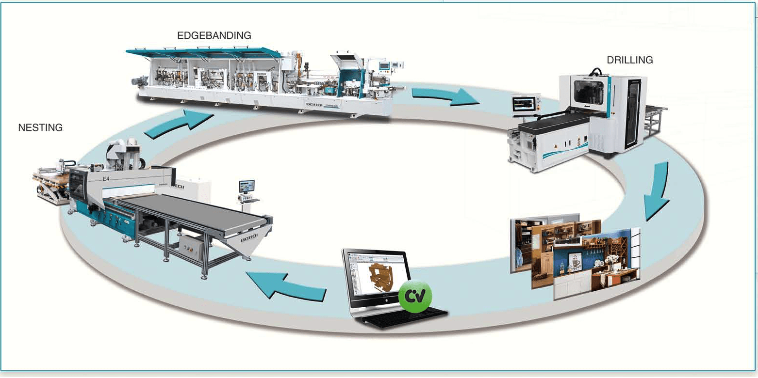 Aceasta linie de productie poate fi configurata si in sistem de automatizare completa, pentru panouri, fronturi sau dulapuri.