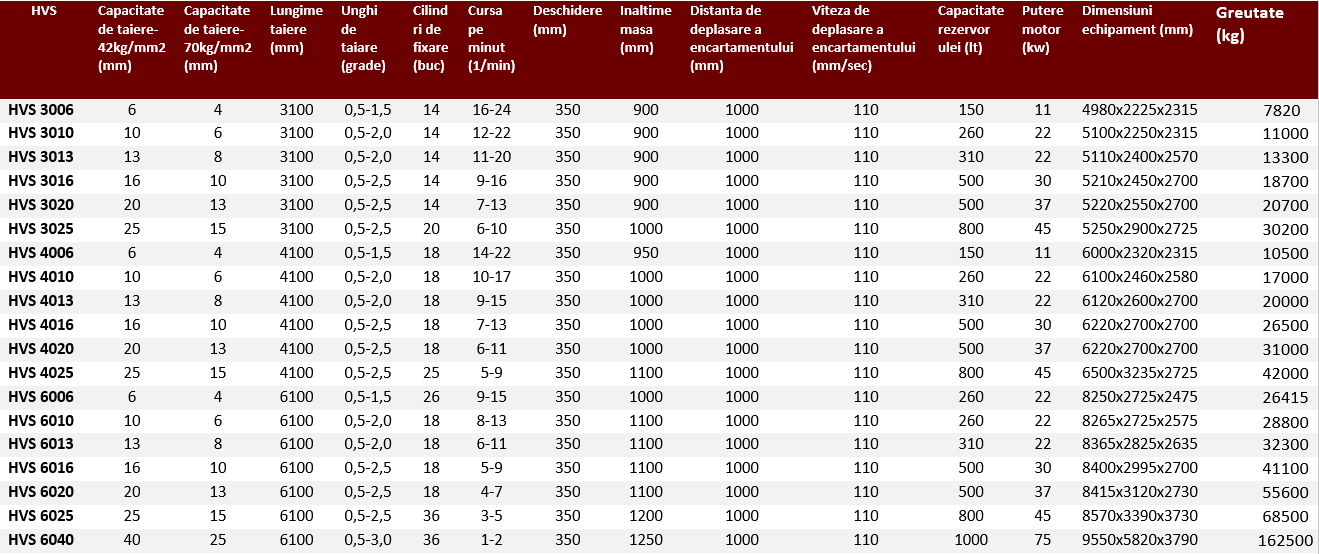 HVS Capacitate de taiere-42kg/mm2 (mm) Capacitate de taiere-70kg/mm2 (mm) Lungime taiere (mm) Unghi de taiare (grade) Cilindri de fixare (buc) Cursa pe minut (1/min) Deschidere (mm) Inaltime masa (mm) Distanta de deplasare a encartamentului (mm) Viteza de deplasare a encartamentului (mm/sec) Capacitate rezervor ulei (lt) Putere motor (kw) Dimensiuni echipament (mm) Greutate (kg) Pret (€)
