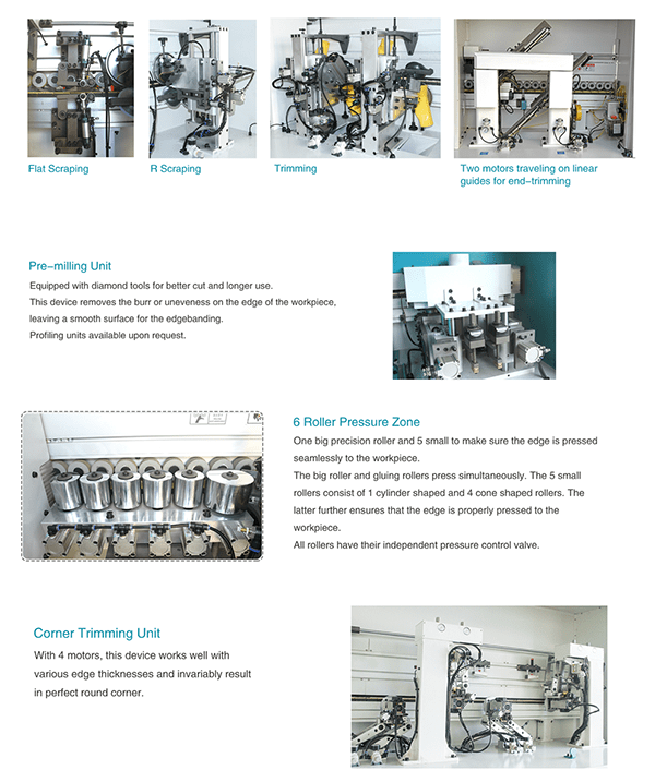 - Functii disponibile: prefrezare, lipire si aplicare cant, presare, taiere la capete, taiere sus jos, rotunjire, taiere la 45 grade la colturi, perii pentru curatare, lustruire, pulverizare agent degresare..