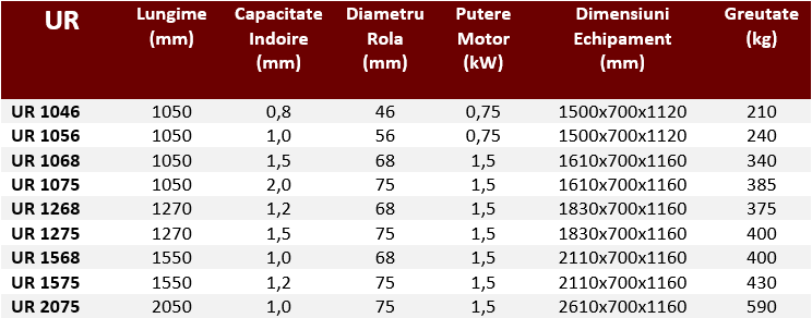 UR Lungime (mm) Capacitate indoire (mm) Diametru rola (mm) Putere motor (kW) Dimensiuni echipament (mm) Greutate (kg) Pret (€)